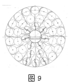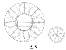 子母钻头扩刀,它可自行上下坡、自行拐弯,每前级外径是后级的内径,留下一个大的空间加宽输送带参见图5。直径越大子钻头越多,都是在母钻头内腔的切削面内产生环绕网状交叉切削,而且巧妙利用所挖掘好的空间,加宽输送带的输送渣土的能力,钻头直径越大内向空间就越大,布置的输送带越宽,运输能力成几倍增加,破碎能力快,检修空间大。对桥拱式大跨度隧道掘进方法。