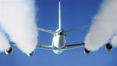 NASA的DC-8飞行实验室的引擎喷发出膨胀的白色航迹云,这张照片是由一架飞行在它300英尺(约91.44米)后的HU-25猎鹰号喷气式飞机拍摄。用DC-8来研究高空中复合燃料对引擎运作以及航空器排放的航迹云的影响。
