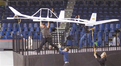 德国不伦瑞克科技大学的学生放飞翼展15米的纸飞机挑战世界纪录。学生们的纸飞机没能打破飞行15米的吉尼斯世界纪录,该巨型飞机仅飞了10米就已着陆。