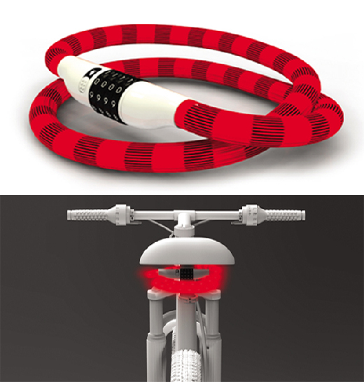 在购买自行车后,大家首先都会想到给爱车配上一把牢靠的车锁,而在骑车过程中车锁往往会被随意缠在车座下。也许是受到这一习惯的启发,设计师通过这款能发光的车锁将保护自行车的安全和保护交通安全很好的结合在了一起。这款车锁采用了密码锁设计内置电池,以比钢丝更坚固的碳纤维为锁身,并在其上分段设置了LED显示装置,锁头上除密码转轮外还有控制灯光的开关。输入预设密码,打开灯光开关,再将车锁缠在车座下,它就是一盏醒目的自行车尾灯了。