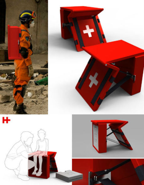 这种治疗长凳由Adrian Candela设计。这种难以置信的工具可以打包成一个背包,使用时可将背包打开变成一个治疗长凳。背包中还可装一条毯子和医疗工具箱。因此,救灾人员可以很方便地携带这种重要的救灾装置快速出现于救灾现场。它采用相同的材料制成,经久耐用,而且它还具备皮艇的功能,可以漂浮于水面之上而不下沉。
