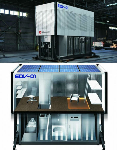 对于紧急事件响应者来说,最大的挑战之一就是缺水和现场电源。EDV-01自给自足移动应急单元可以解决这个难题,该装置每天可以从空气中收集20公升的饮用水,这足以够两个成年人使用。屋顶的太阳能系统和燃料电池为整个应急单元提供电力。更为难得的是,这个不锈钢集装箱根本不需要现场组装。一个液压泵可以升高墙壁,形成两层结构。四个液压支柱可以保证整个应急单元在崎岖的地面上也能够保持平衡稳定。