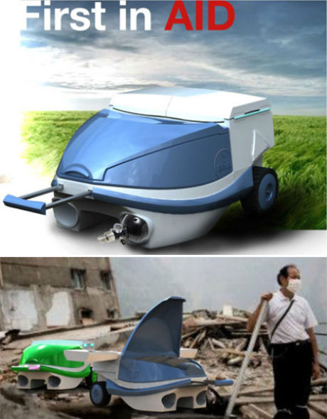 这种表面上看起来非常简易的手推车可以帮助医生运送重要医疗用品到灾区,即使在崎岖不平的地面上它也可以正常工作,它可以折叠或伸展,变成一个工作站或板凳。伤员可以临时坐到上面接受治疗。这种现场临时诊所可以让紧急事件响应者更高效地工作。