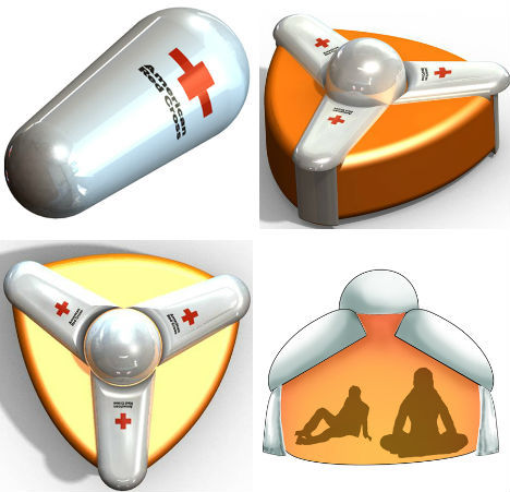 一种卵状的便携式保护舱可以空投到灾难现场,它可以迅速伸展成一个三脚架形状,拥有两层支架。一个橙色的尼龙材料的防破裂外壳,可以防水、防风,并将内部空间最大化。