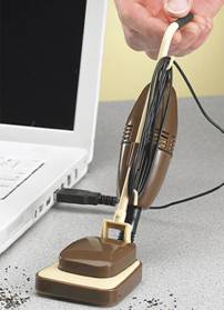 看到键盘里堆积了很多灰尘和面包屑,又不知道如何清除,你该怎么办?现在有人研制出这种微型超轻真空吸尘器,利用它可以轻松清除掉键盘里的脏物。USB接口真空吸尘器的外形跟普通的吸尘器差不多,但可以把它插在笔记本电脑上充电。它带一根长45英寸(1.14米)的线,因此可以用它清洁桌子的各个角落。