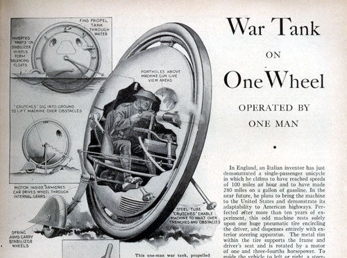 简介:这钟独轮坦克是上世纪30年代德国人的发明。它外观呈诡异的飞碟状,不过这个“飞碟”是竖起来的,轮子就是坦克(如果这也算坦克的话)本身,侧后方两个辅助轮负责保持行驶平衡。其实这种独轮坦克的概念早在第一次世界大战之前就已经有了,可见人们的想象力之丰富。只不过由于当时技术条件的限制,并没有生产出哪怕一辆样车。