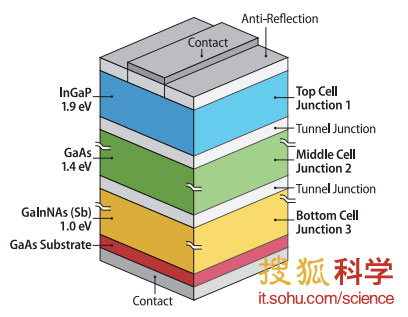 太阳能电池生产商Solar Junction开发出了一种电池能够存储吸收到的43.5%太阳能,其效能比其他有记录的电池要高1.2%的左右。
